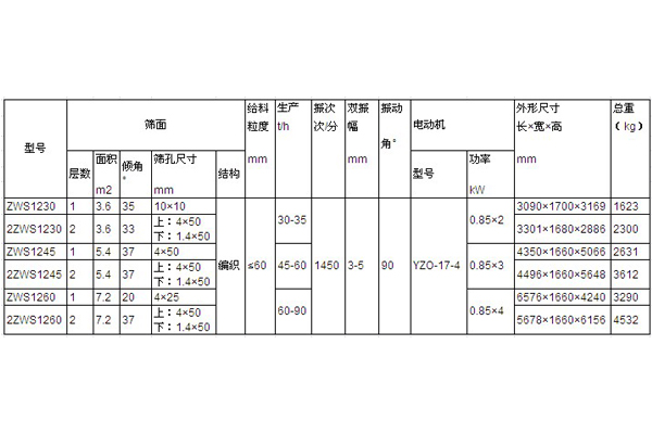 ZWS型振網(wǎng)篩是以振動電機(jī)做為振動源,牽引篩網(wǎng)及篩框振動,實(shí)現(xiàn)物料分級。ZWS振網(wǎng)篩由給料器、篩箱篩面機(jī)體料斗和振網(wǎng)裝置組成。材料由給料器均勻給到篩面,分成篩上產(chǎn)品與篩下產(chǎn)品(單層篩)。本系列振網(wǎng)篩以振動電機(jī)為振動源,牽引篩網(wǎng)上下振動,篩機(jī)振幅可調(diào),以適應(yīng)不同物料的分級。篩網(wǎng)的振動,一方面可防止篩網(wǎng)堵塞,同時使物料拋起向前彈跳實(shí)現(xiàn)分級,因而振網(wǎng)篩的篩分效率高。 ZWS型振網(wǎng)篩主要特點(diǎn): 1.密封防塵,維修方便。 2.篩機(jī)振幅可調(diào),篩分效率高。 3.生產(chǎn)能力大,動負(fù)荷小,噪音低。參數(shù)